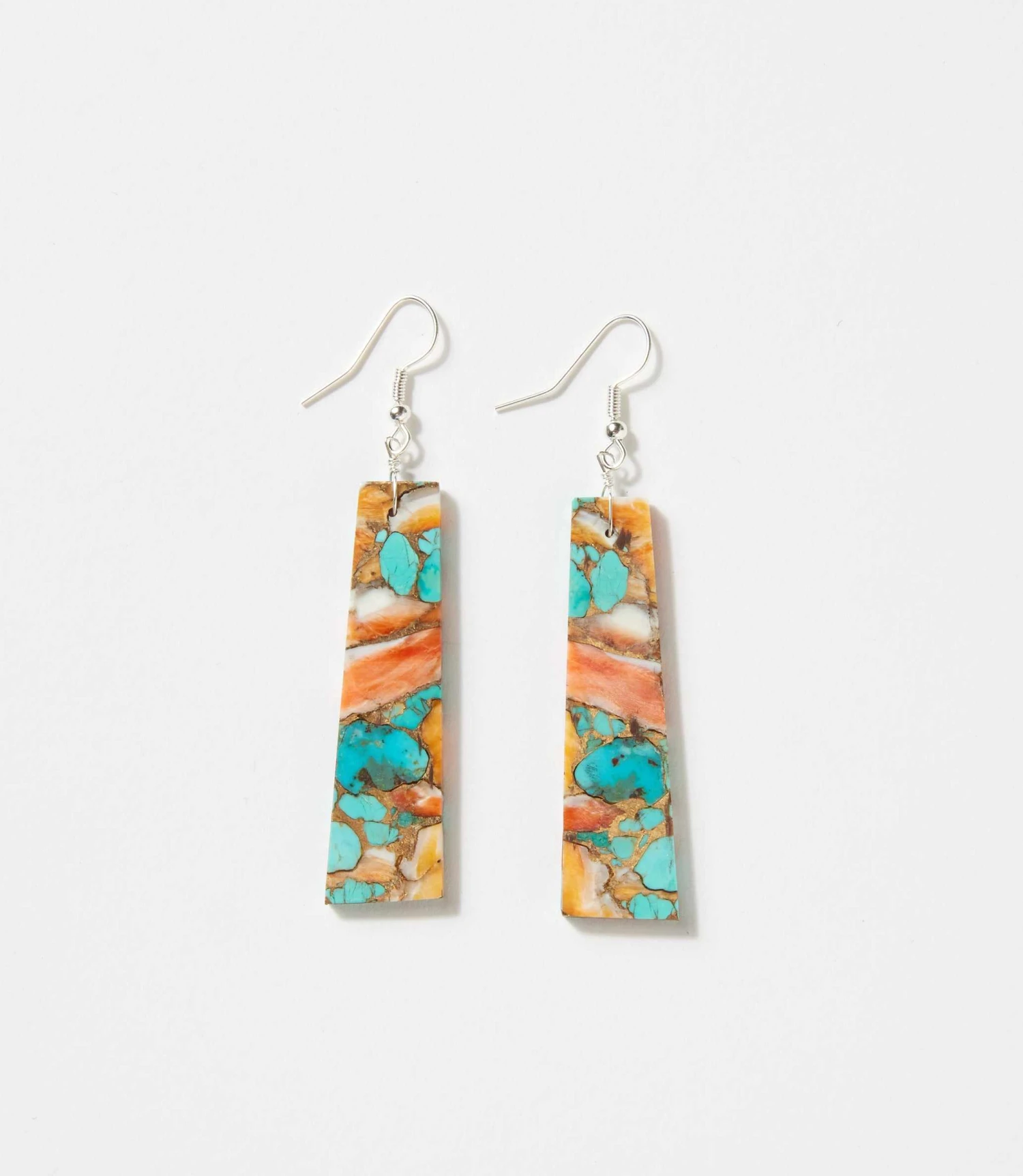These Angular Turquoise and Spiny Oyster Earrings feature tapered rectangular drops showcasing a striking mosaic of turquoise and spiny oyster shell. A small translucent bead sits just beneath the sterling silver French hooks, adding a delicate touch of shimmer and visual transition.