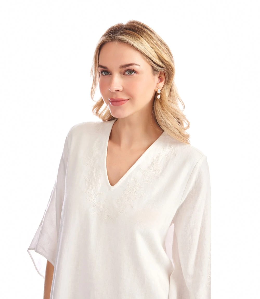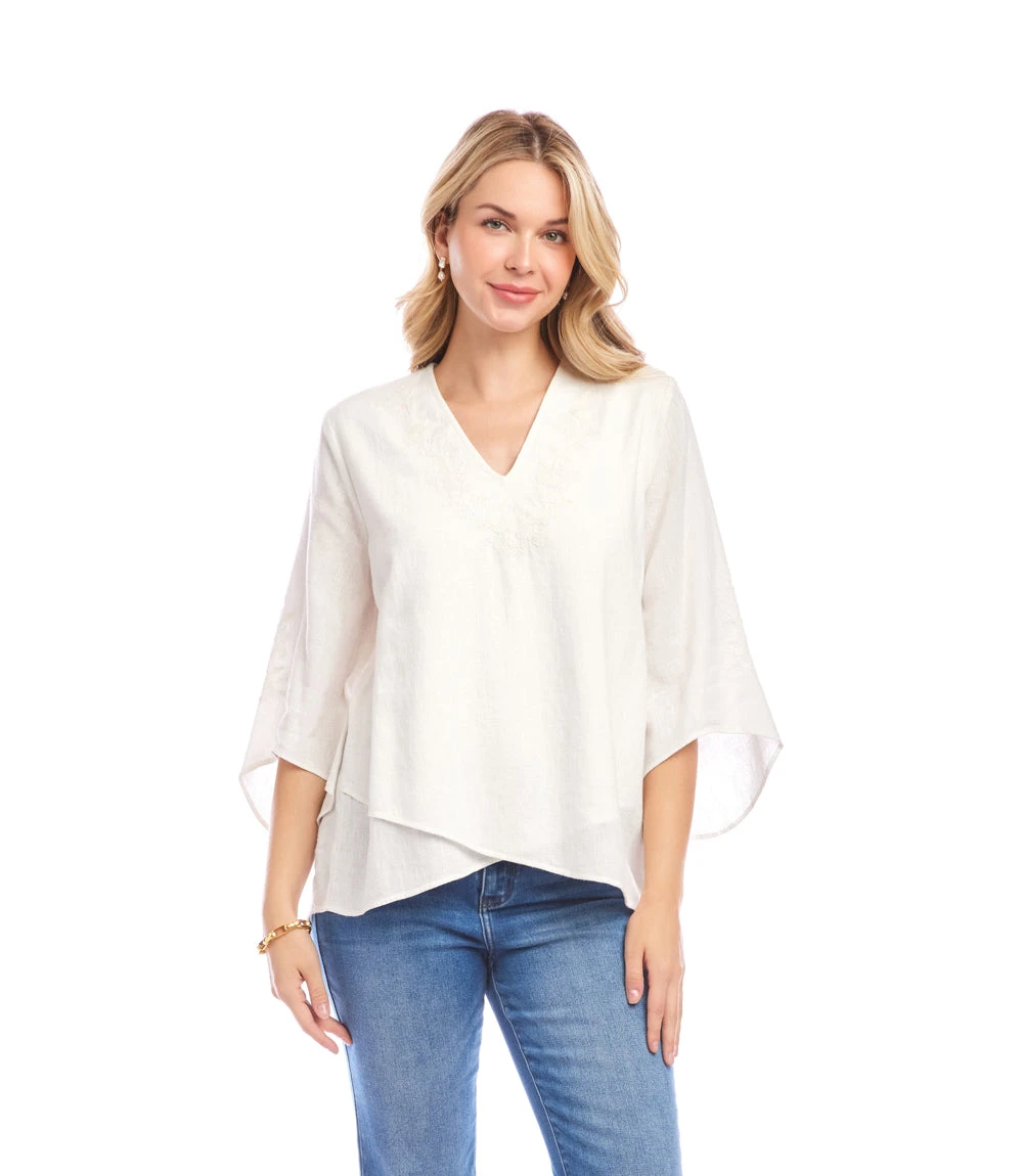 This Bracelet Sleeve Embroidered Asymmetric Top is crafted from a soft linen blend woven fabric and features a flattering V-neck, elegant bracelet sleeves, and a unique asymmetric hem. It is beautifully embroidered along the neck and sleeves for a feminine touch. Offered in cornflower blue and off-white, this versatile top is perfect for both casual and dressier occasions.