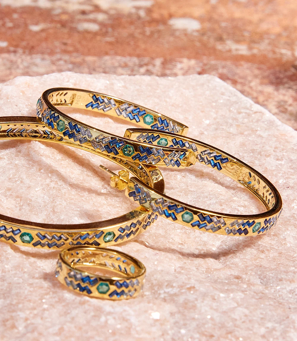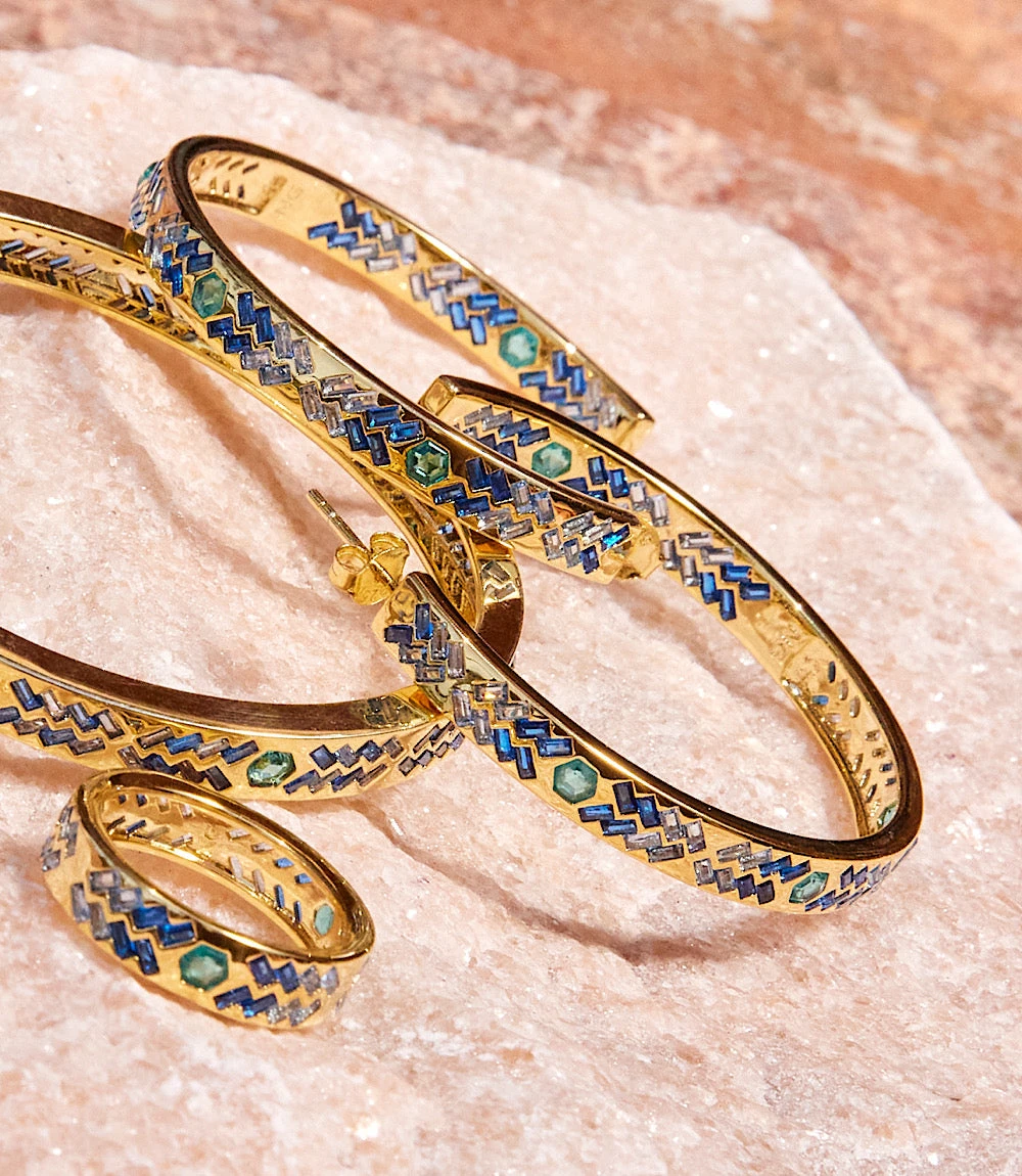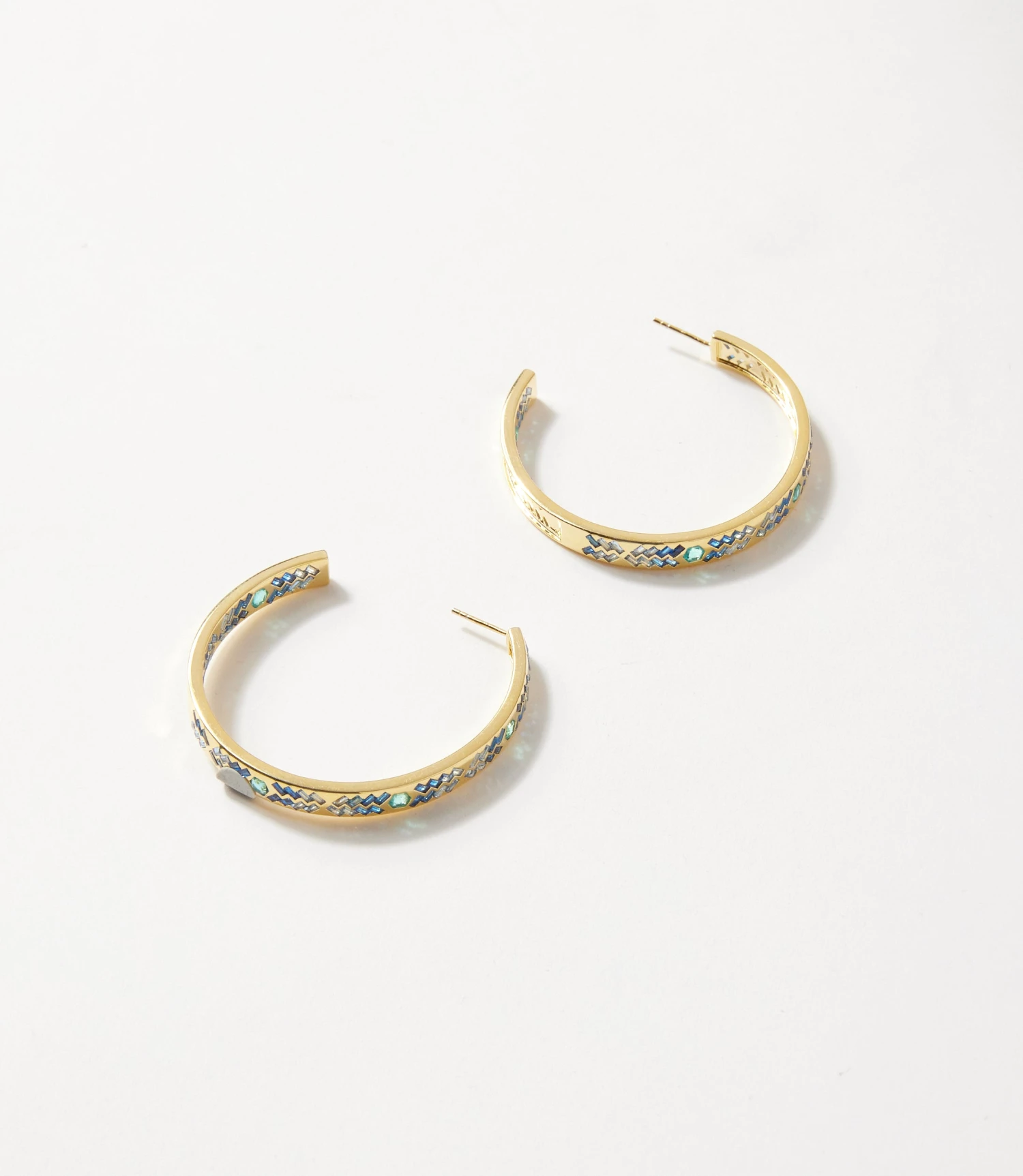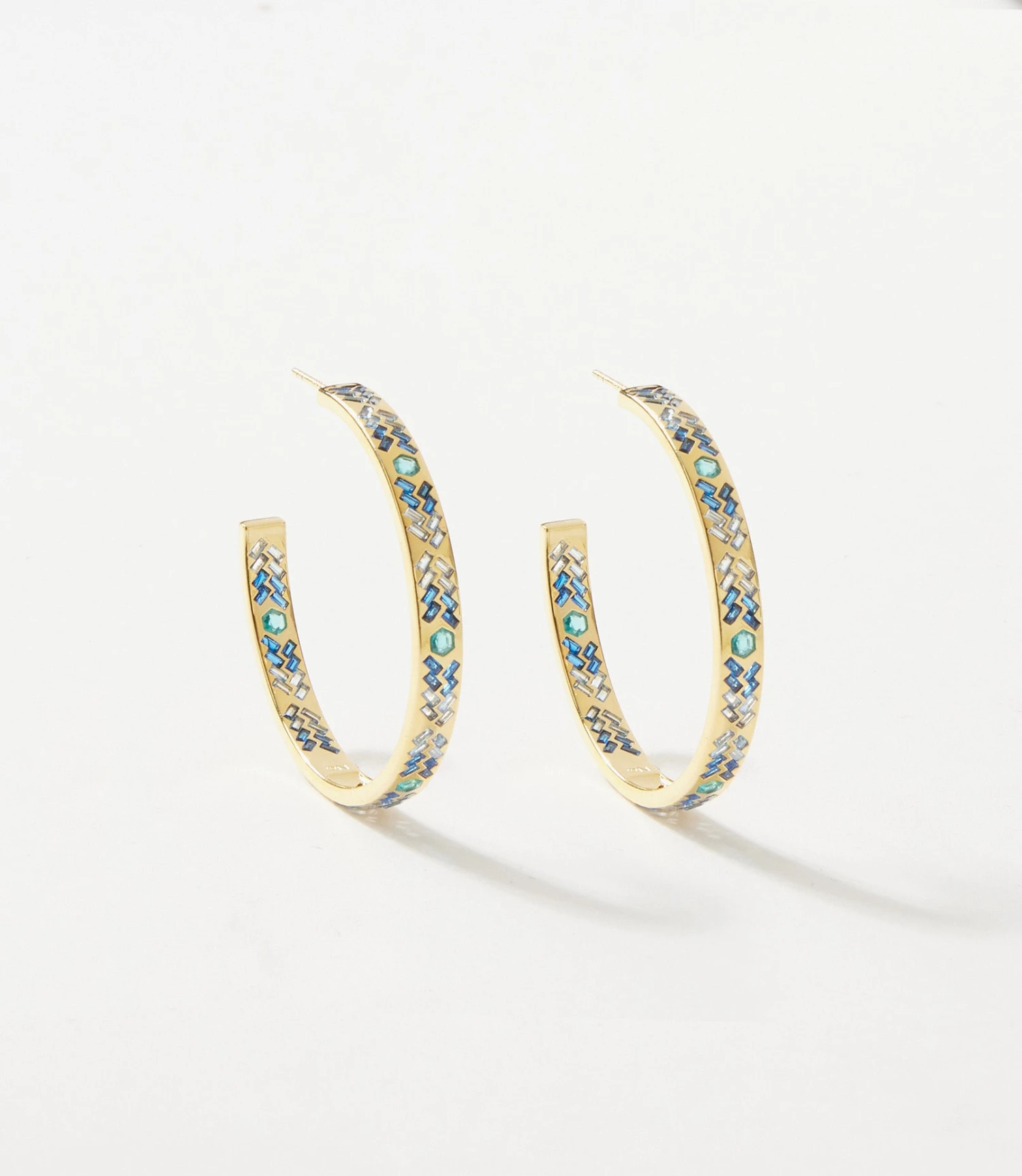 Add a pop of color with these Crystal Inlay Hoop Earrings, featuring delicate blue cubic zirconia set into sleek gold-plated brass. The shimmering inlay creates a modern, eye-catching look that’s perfect for both casual and dressy styles.