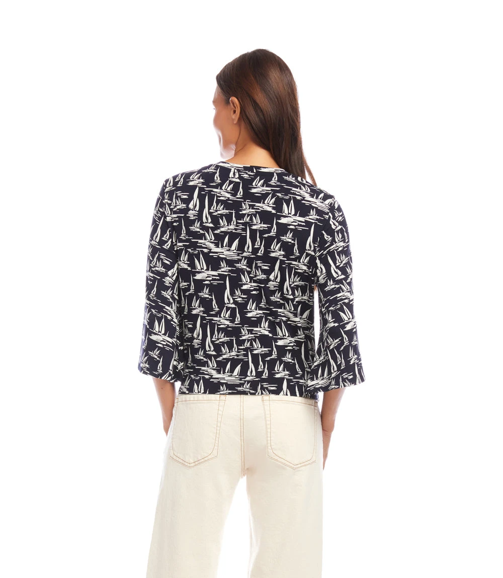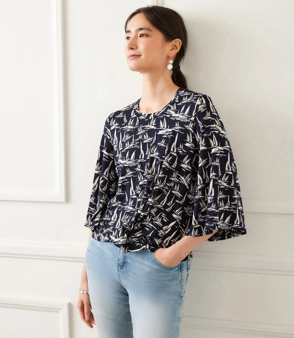 The Flare Sleeve Drape Front Top features a flowing draped front paired with dramatic flare sleeves for a sophisticated, feminine silhouette. Crafted from soft sailboats knit print fabric, the white sailboats stand out against a navy background, offering a nautical-inspired look.