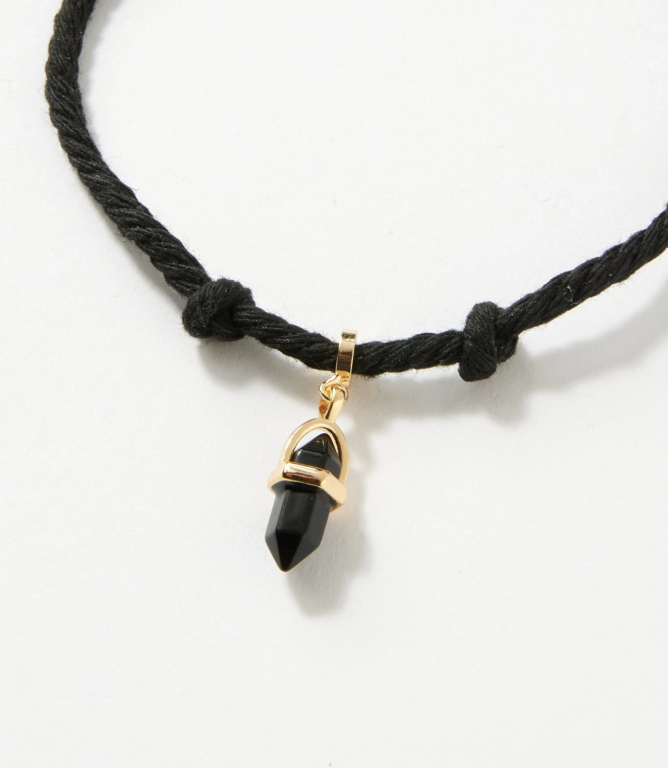 A sleek and minimal piece with a touch of edge. This bracelet features a polished black gemstone point set in gold-plated detail, strung on a soft cotton cord with an adjustable closure for a comfortable, customizable fit. Perfect for layering or wearing solo for effortless style.
