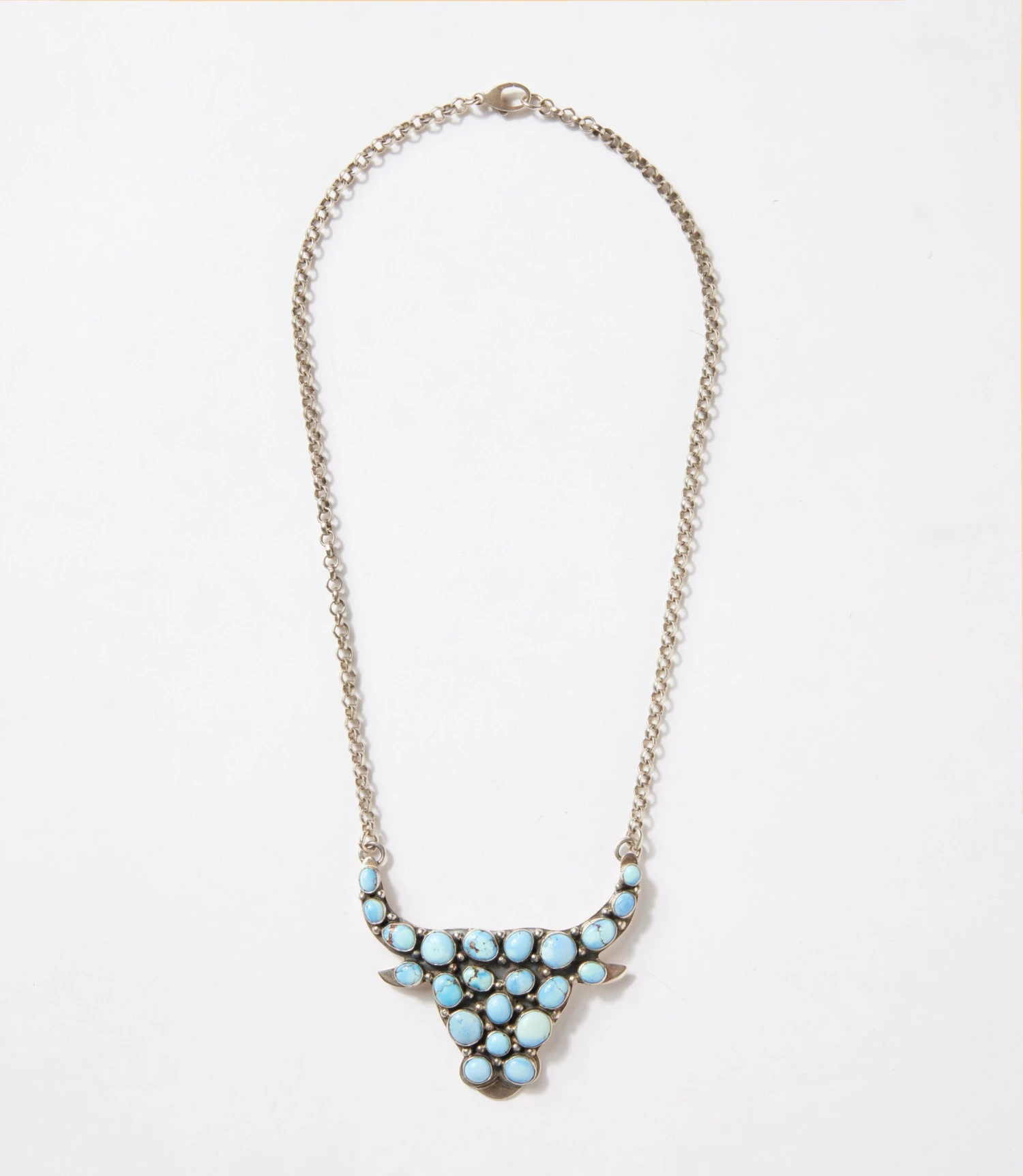 A bold fusion of natural beauty and timeless craftsmanship. Featuring a rare Longhorn turquoise stone from Nevada’s renowned Golden Hill mine, this necklace piece showcases vivid blue to greenish-blue hues contrasted by a golden, earthy matrix. Framed in a sleek sterling silver setting, the stone’s unique patterns echo the rugged landscapes and rich heritage of the region. Suspended from a delicate chain, it’s a striking statement of Southwestern elegance—one as rare and unforgettable as the stone itself.