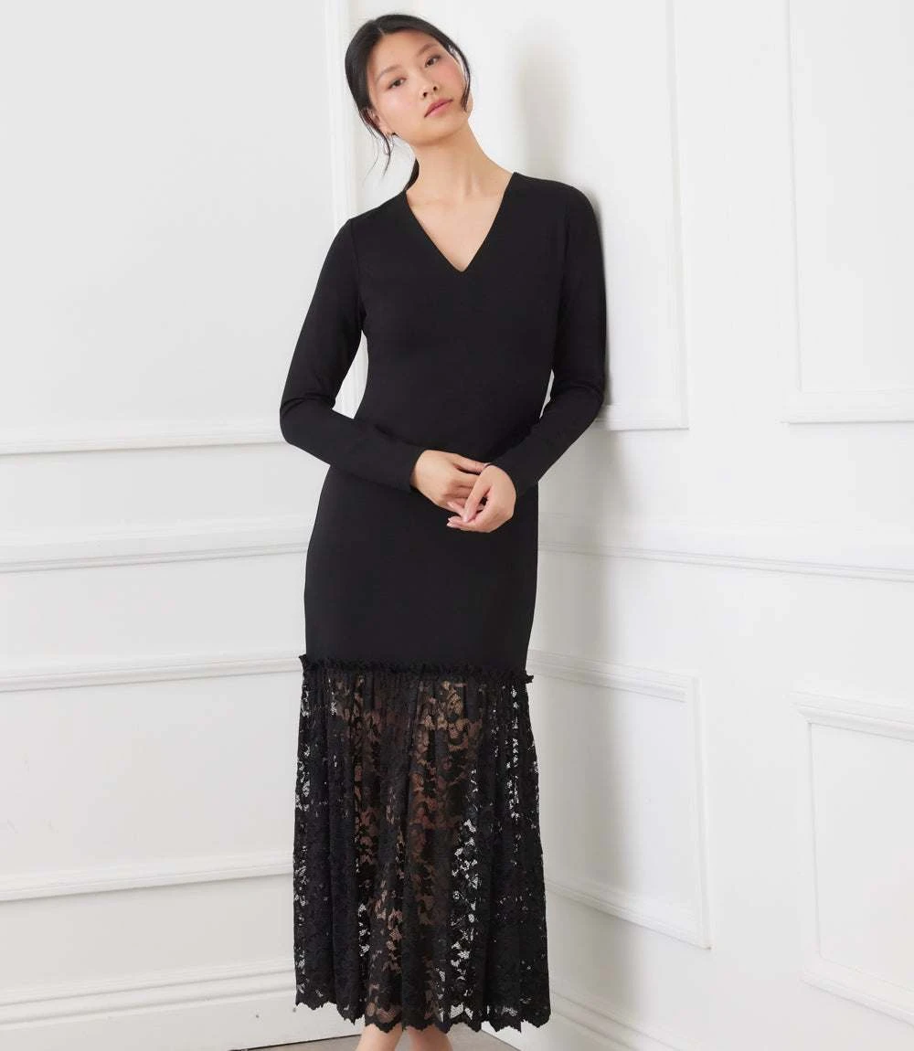 Elegant and refined, this long sleeve column dress is crafted from stretch Ponte fabric for a smooth, flattering fit. It features a sleek V-neckline and set-in sleeves for a clean, tailored silhouette. A delicate ruffle trim at the seam where the Ponte meets the lace adds a soft, feminine touch, while the dramatic contrast lace skirt brings texture and allure. Finished with a back zipper closure for easy wear.