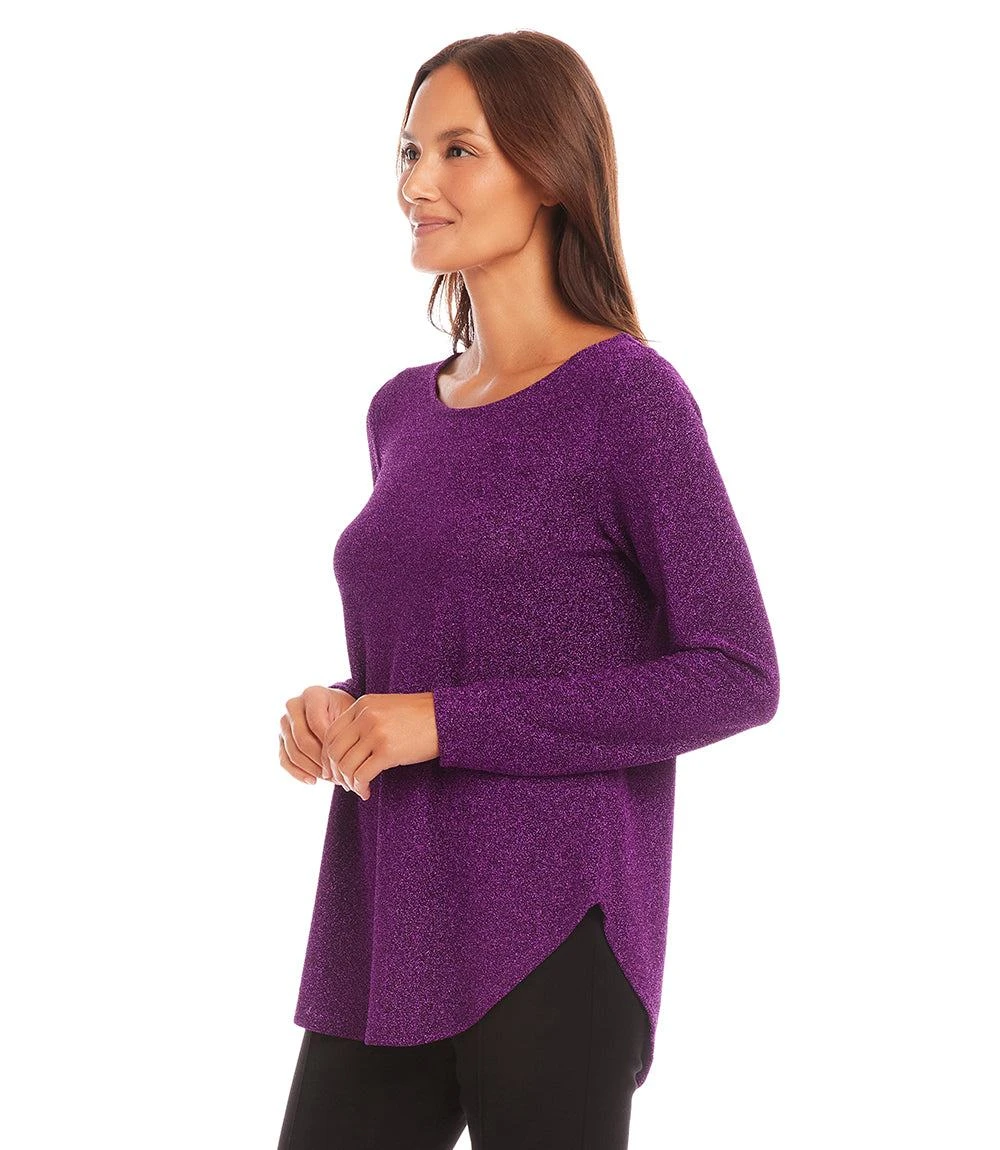 Add a touch of sparkle to your wardrobe with our metallic knit shirttail top. Dress it up for a night out with heels or keep it casual with your favorite jeans and boots. Versatile and stylish, the perfect addition to any outfit.
