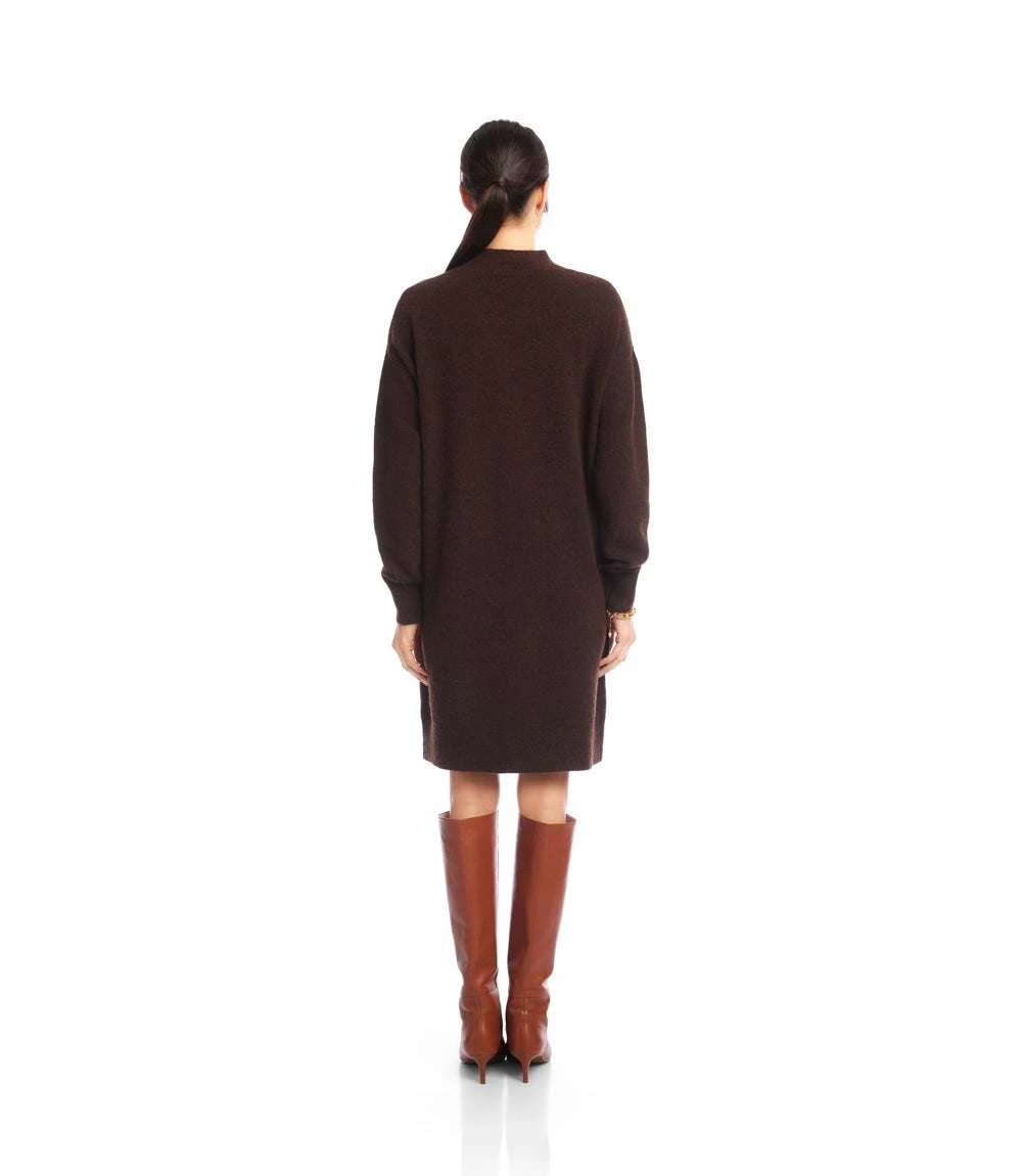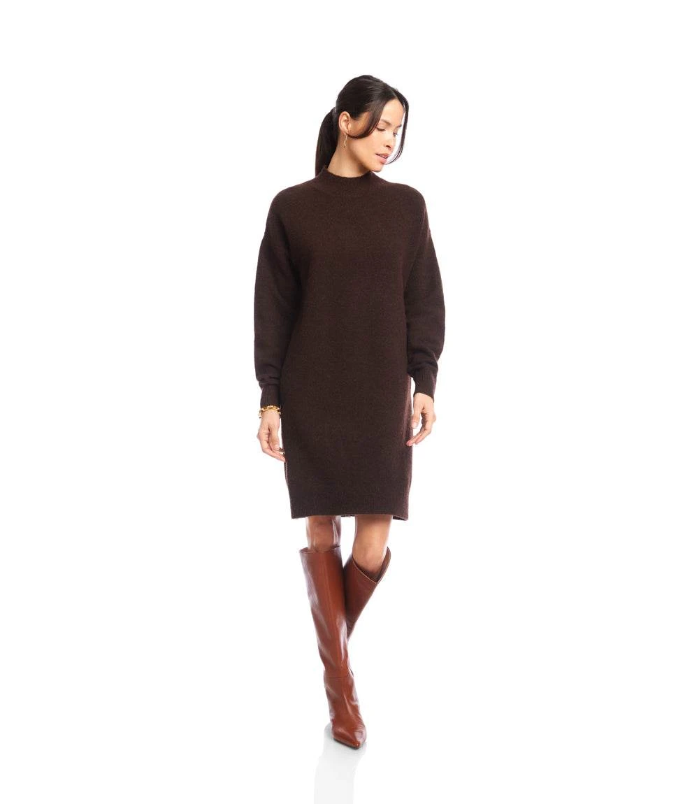 This mock neck sweater dress features long sleeves and soft ribbed edge detailing at the cuffs and hem for a refined finish. Made with a touch of wool for cozy warmth, it’s an effortlessly elegant piece that pairs perfectly with boots for a polished look.