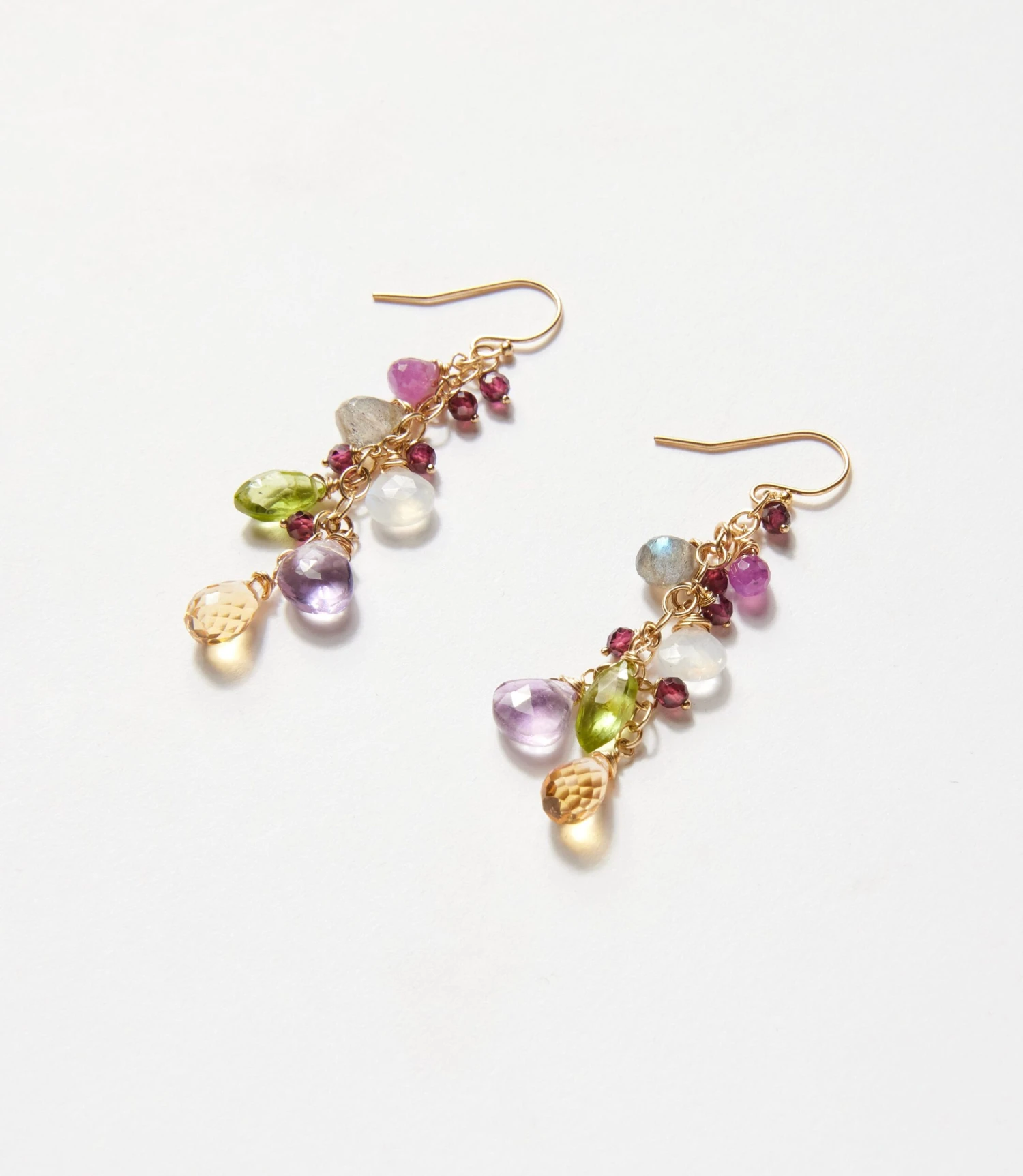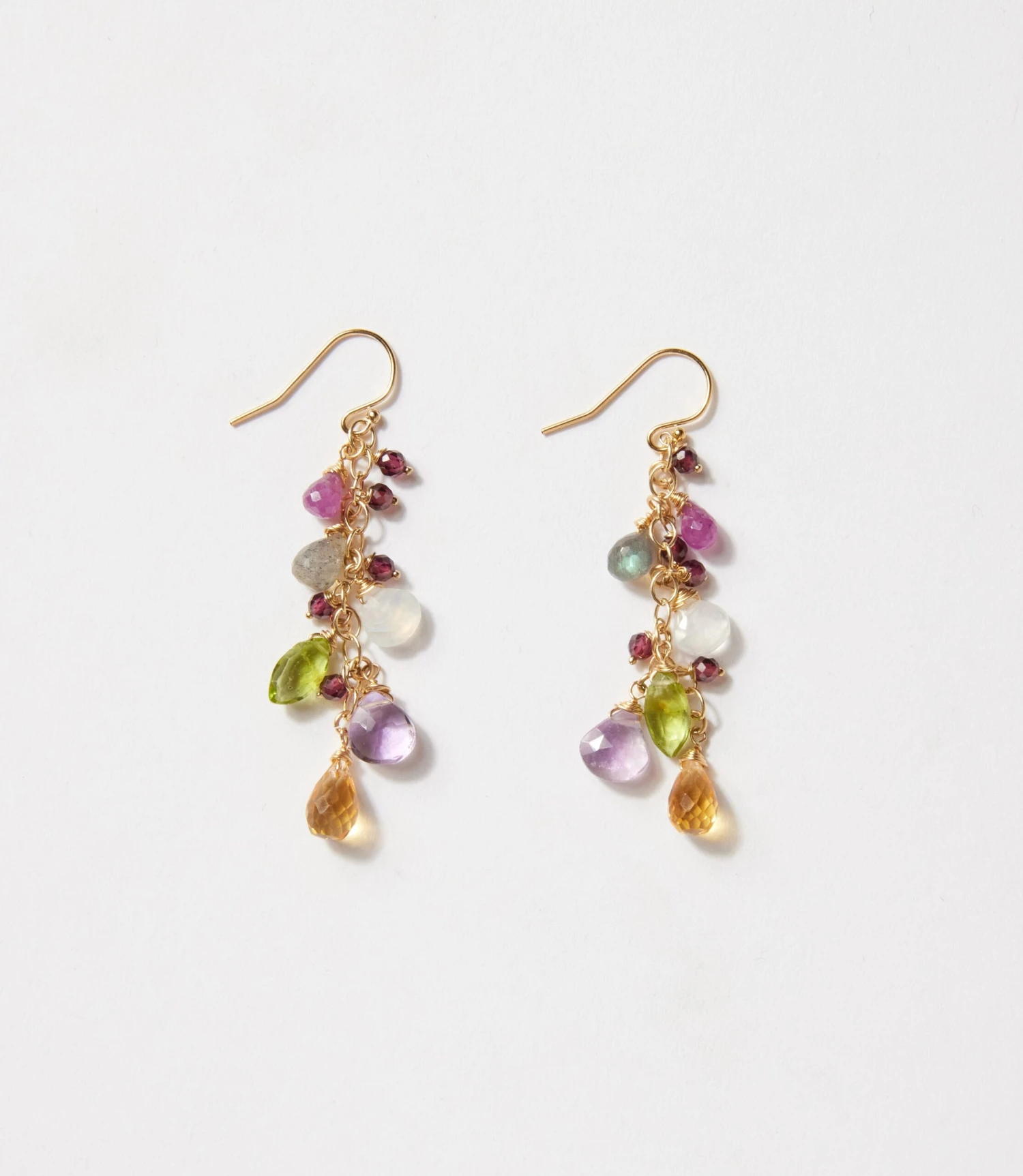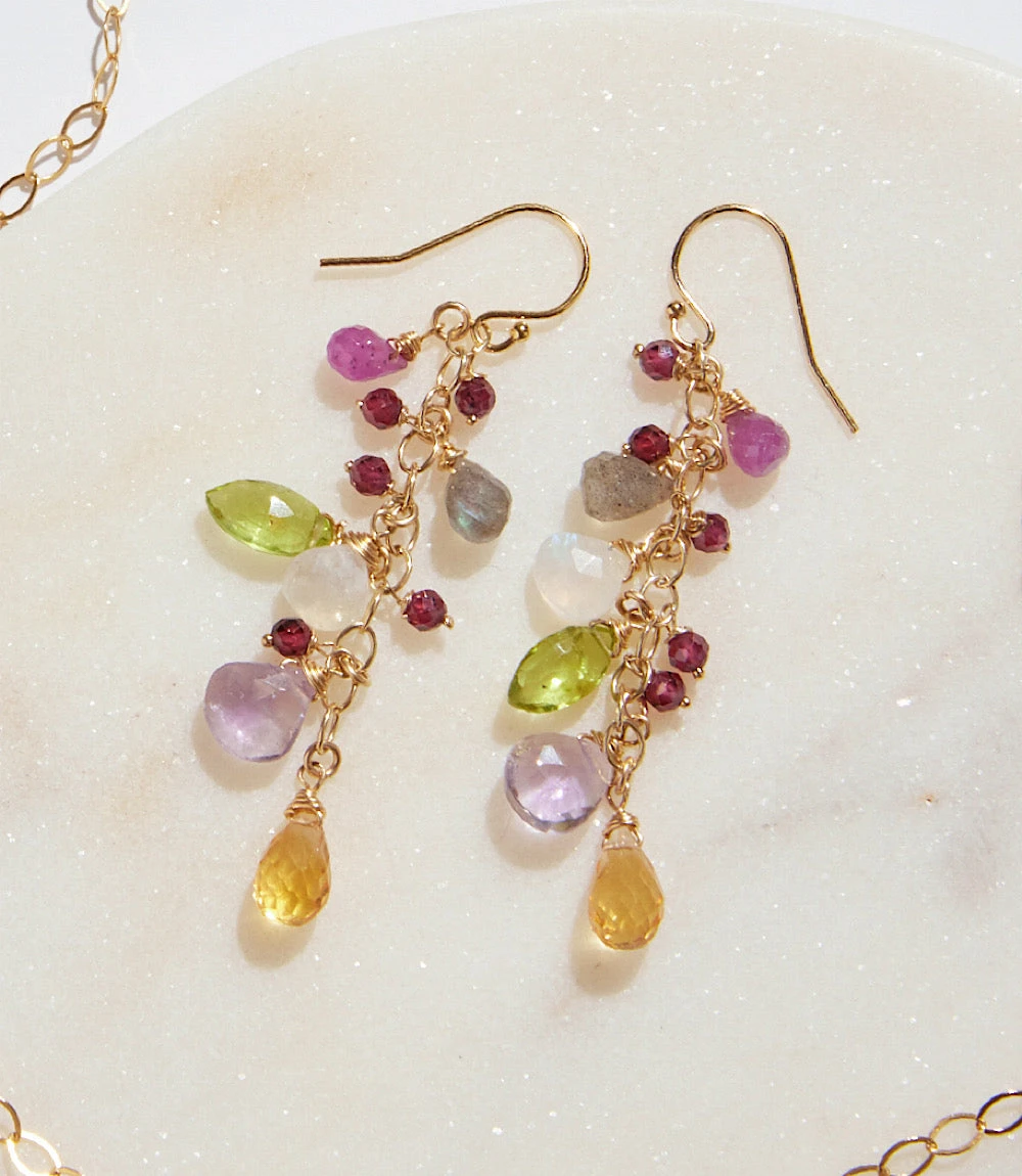 These Multi Gemstone Cluster Earrings showcase a vibrant mix of amethyst, citrine, and peridot drops that shimmer with every movement. Delicately arranged on gold-filled chains, they create a cascading, playful yet elegant look. Finished with simple hook closures for effortless wear.