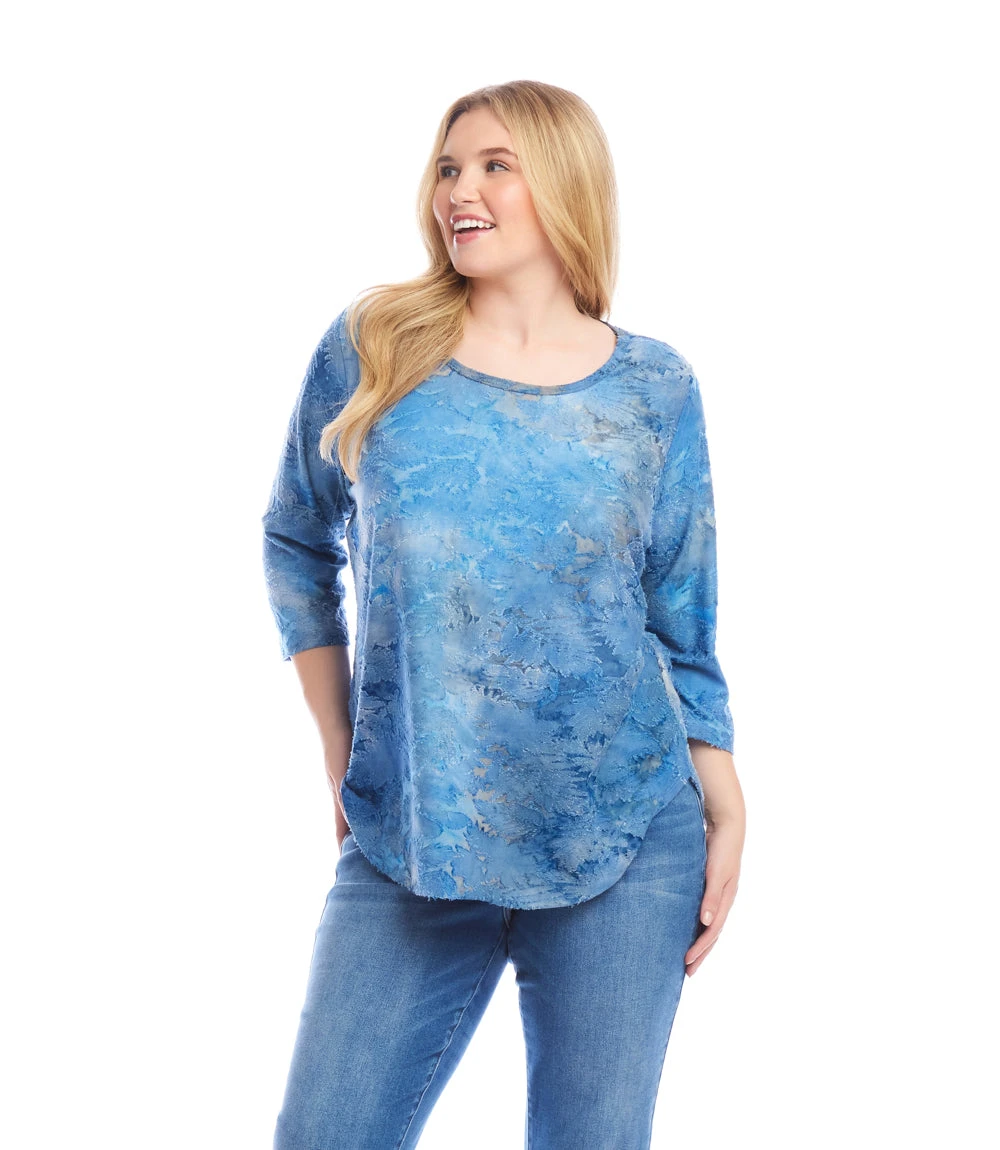 This pullover top is crafted from stretch tie-dye fabric and includes 3/4 length sleeves, a scoop neckline, and a relaxed fit for comfort. The shirttail hem adds a casual, effortless touch ideal for everyday wear.