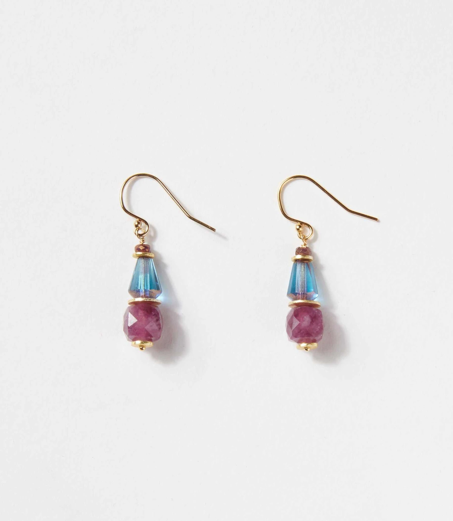 These Ruby and Blue Glass Earrings pair faceted ruby gemstones with shimmering Czech glass for a striking mix of color and texture. Set on gold-filled hooks, they bring a touch of refined elegance with a playful pop of contrast.