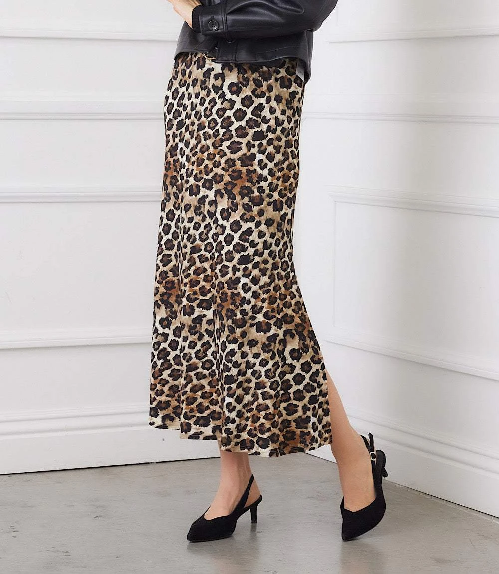 This striking skirt brings effortless style with its sleek silhouette and side slit detail. Designed with an easy pull-on elastic waistband, it’s finished in an animal print knit and a flattering midi length.