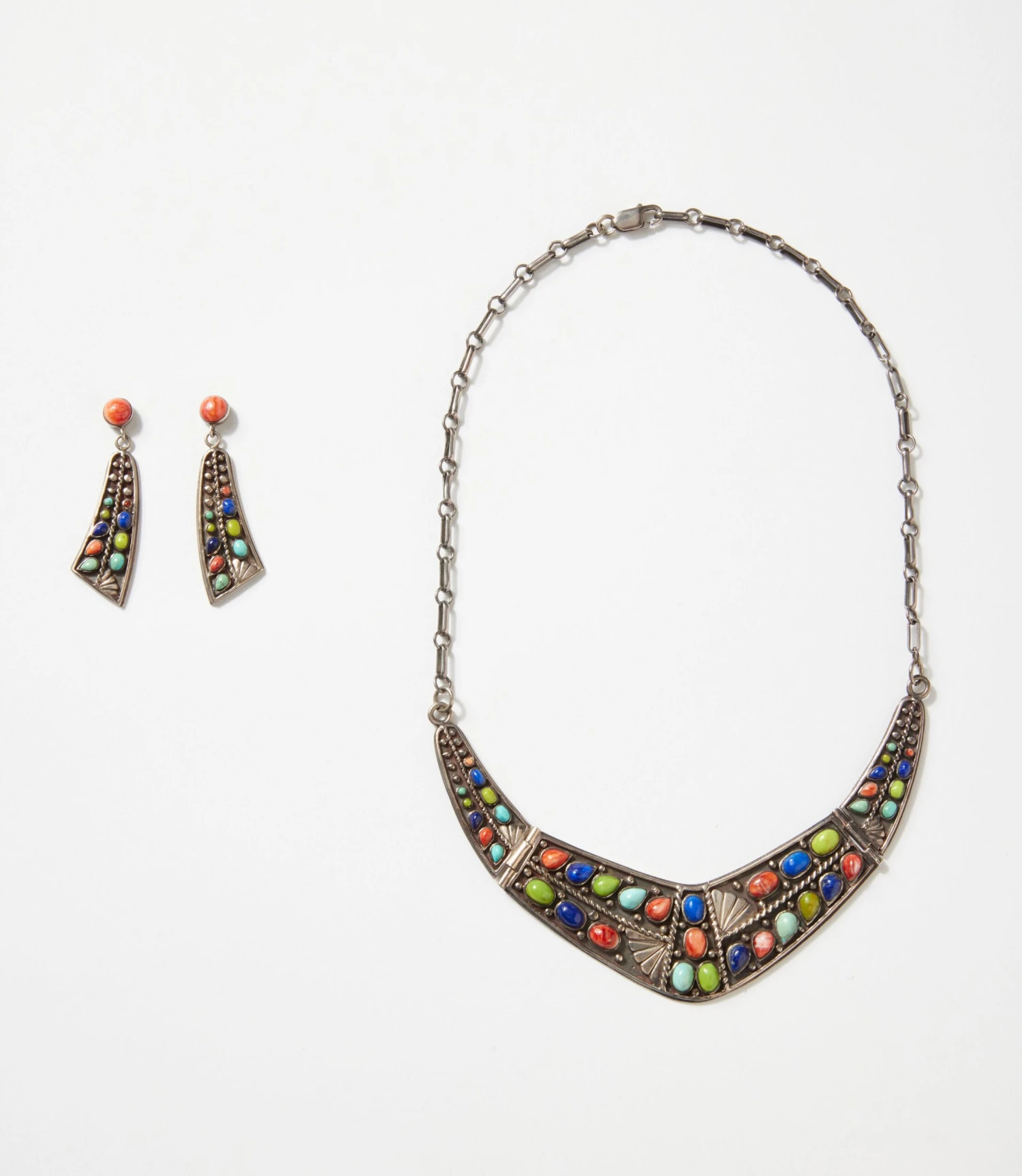 This striking set features a bold V-shaped collar necklace paired with matching drop earrings, all inlaid with a vibrant mosaic of turquoise and multicolored gemstones. The necklace is crafted in three articulated sections, allowing it to drape naturally along the collarbone for a comfortable fit. Intricate sterling silver detailing adds texture and dimension, while a secure lobster clasp ensures reliable wear.