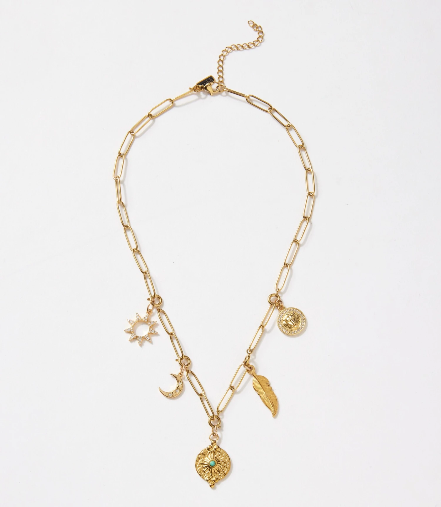 Infused with desert dreams and cosmic symbols, this gold-tone charm necklace features a radiant mix of icons including a feather, crescent moon, sunburst, and textured medallions. Crafted with a 16K gold over stainless steel chain and adorned with cubic zirconia, the pendants are made from a blend of 16K plated stainless steel and brass.